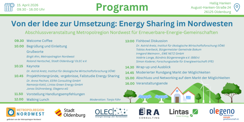 Genau hier setzt unser Forschungsprojekt „Metropolregion Nordwest für Erneuerbare-Energie-Gemeinschaften“ an. Seit 2023 arbeiten wir vom OLEC gemeinsam mit der Stadt Oldenburg, Lintas Green Energy, EERA Consulting und der Oldenburger Energiegenossenschaft (Olegeno eG) – daran, die Akteur*innen im Nordwesten energy-sharing-ready zu machen.