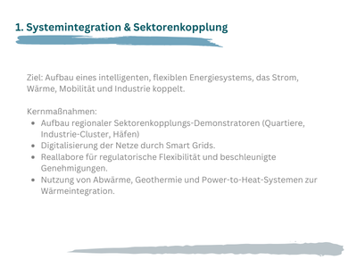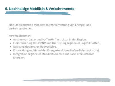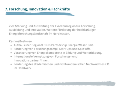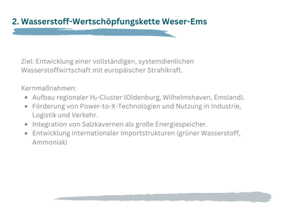Weser-Ems ist auf den Weg zur Leitregion für Energie- und Industrietransformation, die ihre Stärken in den Bereichen Wasserstoffwirtschaft, Offshore-Windenergie, nachhaltige Logistik, Kreislaufwirtschaft und digitale Energieinfrastruktur bündelt. Wertschöpfungsketten sollen dort entstehen, wo grüne Energie in großer Menge und zu wettbewerbsfähigen Preisen verfügbar ist.