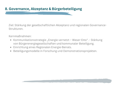 Die Region Weser-Ems entwickelt sich bis 2035 zur Leitregion für ein integriertes, klimaneutrales Energiesystem. Die Vision basiert auf Dekarbonisierung, Systemintegration, regionaler Wertschöpfung, Resilienz und gesellschaftlicher Akzeptanz. Unser Leitbild 2035: „Energie. Vernetzt. Nachhaltig. Resilient.“