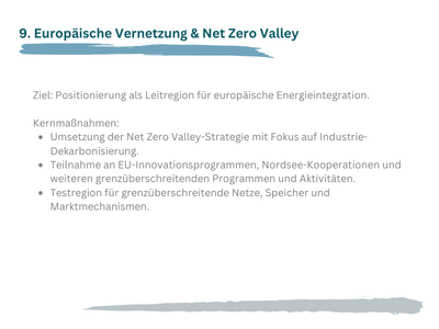 Mit der Anerkennung des NetZero Valley Nordwest Deutschland strebt die Region an, sich als Modellraum für klimaneutrale industrielle Transformation in Europa zu etablieren. Dieses Valley – das 23 % der Fläche Niedersachsens und 3 % Deutschlands umfasst – verbindet das Emsland, Ostfriesland, das Oldenburger Land sowie den Elbe-Weser-Raum zu einem leistungsfähigen Wirtschafts- und Innovationsraum. Ziel ist es, durch gezielte Investitionen, beschleunigte Genehmigungsverfahren und die enge Vernetzung von Industrie, Forschung und Verwaltung den Wandel hin zu einer Netto-Null-Wirtschaft zu gestalten.