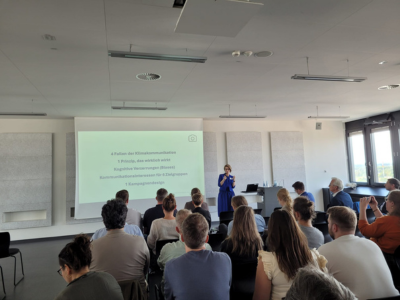 Das anschließende Netzwerkkarussell regte mit einer Posterausstellung zum lebendigen Austausch der Gäste mit den beteiligten Forschungseinrichtungen, Institutionen und Wissenschaftler:innen an. Das Forschungsfeld 1 präsentierte eine regionale Online-Plattform für Energieeffizienz und neue Geschäftsmodelle. Sichere Gateways und Router als Grundlage für Mehrwertdienste im wohnwirtschaftlichen Kontext standen im Mittelpunkt beim Forschungsfeld 2. Unter dem Titel „Digitalisierter Experimentalcampus Bauphysik“ digitalisierte das Forschungsfeld 3 Gebäude auf einem Hochschulcampus. Das Forschungsfeld 4 realisierte innovative kälte- und wärmetechnische Anlagen auf einem Universitätscampus, um Sektorenkopplungen zu erforschen. Im Forschungsfeld 5 wurden am Beispiel von Bremen Transformationsstrategien für urbane Fern- und Nahwärmeversorgungssysteme in Quartieren entwickelt. Das Forschungsfeld 6 präsentierte ein Kataster für Erneuerbare Energien und Wärme und setzte dieses anhand kommunaler Liegenschaften um.
